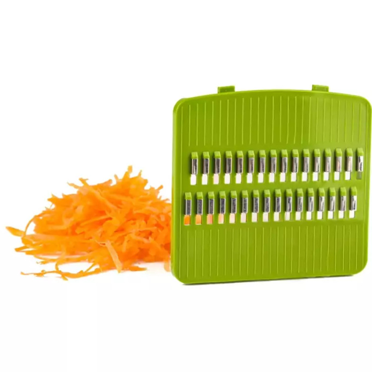 کیفیت عالی کلیه قطعات 7 کاره (دایسر بزرگ - دایسر کوچک - تیغ چیپس ساده - تیغ چیپس فرمدار - پوره کن یا رنده - خلال کن کوچک - خلال کن بزرگ) مناسب برای انواع سبزیجات، میوهها، پیاز، سیبزمینی و … بدنه از جنس پلیکربنات (PC) و نشکن همراه با مخزن نگهداری ابزارها، دستگیره محافظ، درب ساده، تخت کار، فرچه و ابزار مناسب برای شستشو تیغهای بسیار تیز / بدون آب انداختن برای سبزیجات و پیاز و … کارتن کادوئی